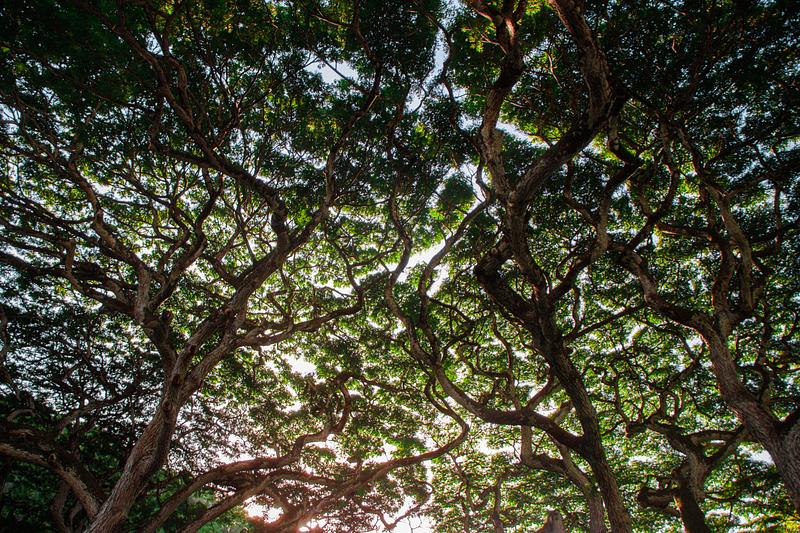 The Monkeypod trees of Oahu, Hawaii are a true wonder of nature. Their branches stretch out in every direction, creating a natural ceiling enveloping the tropical floor in an intricate masterpiece. The sunlight filters through the leaves, casting dappled shadows on the ground below. It's a place of peace and tranquility, a haven where the worries of the world seem to fade away.