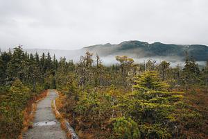 In the wetlands of Douglas Island, Alaska, intricate patterns form in the unique fauna that emerges from the dense fog caused by a season of heavy rainfall. A trail leads the eye deeper into the Tongass, Earth's largest temperate rainforest, comprising a scene that embodies the feel of the untouched wilderness of "the last frontier".