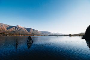 Calm waters soothe the Columbia River as seen from the Stevenson Landing in Southern Washington. The oranges of the setting sun reflect off of the distant Oregon mountains as the clear blue skies mirror each other on the glassy surface as the moon watches from above.