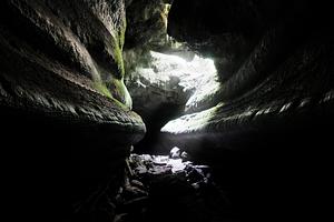 A natural skylight pierces through the ceiling of Ape Caves, with rays of sunshine illuminating the detailed textures of the walls formed from lava flows hundreds of years ago. Dew forms on the cave walls from the crisp, damp air, while sunlight spawns some of the caves only fauna. This image offers a unique perspective on the natural wonder of the underground, showcasing the beauty of the landscape and how it has been forged over generations.