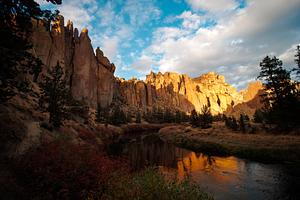 The setting sun casts a warm glow on the otherworldly jagged rocks of Smith Rock State Park, illuminating the intricate features of these cliffs that have made it a mecca for outdoor rock climbing. Adrenaline seekers from all over the world come to Smith Rock to chalk up and test their skills. Look closely, and you'll spot a few. The beauty of Central Oregon's High Desert is on full display in this photograph, a true masterpiece of nature.